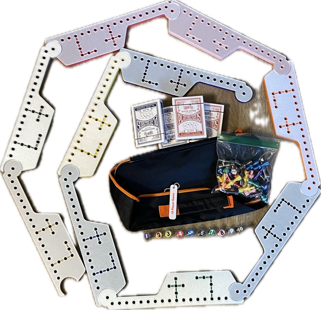 GAME CONTENTS: Complete set includes 10 interlocking board pieces, 50 colorful pegs in 10 different colors, and 4 decks of cards