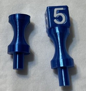Playing pieces also created with 3D printers. Two sets of pegs; one set is single color and the second set contains a number for ease of use for people dealing with color deficient sight.