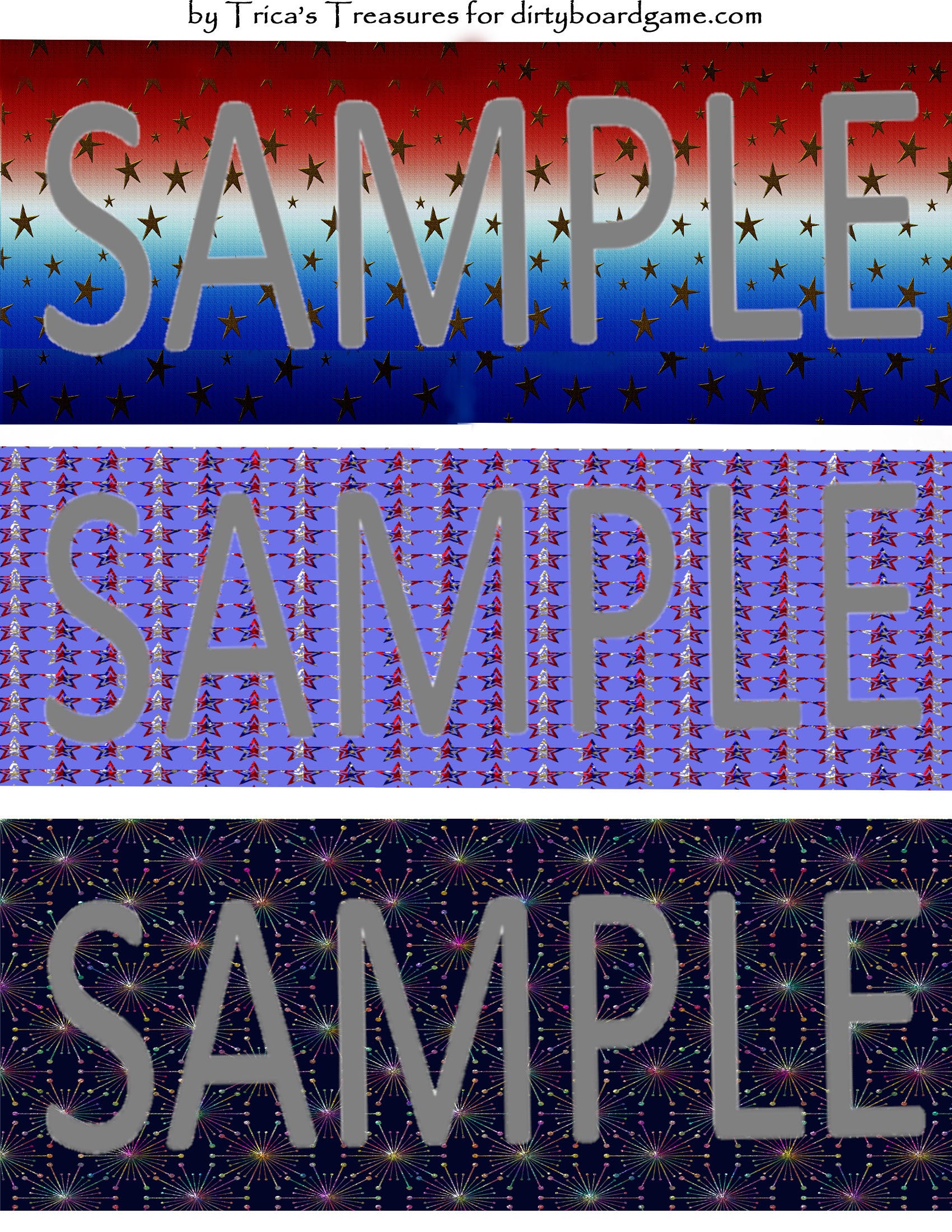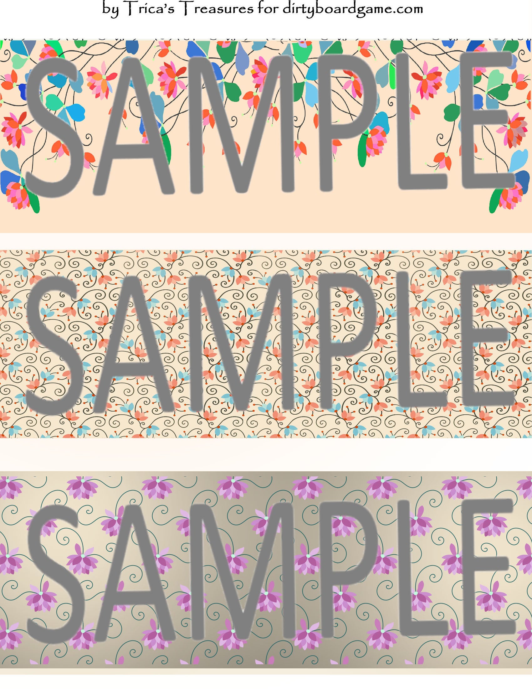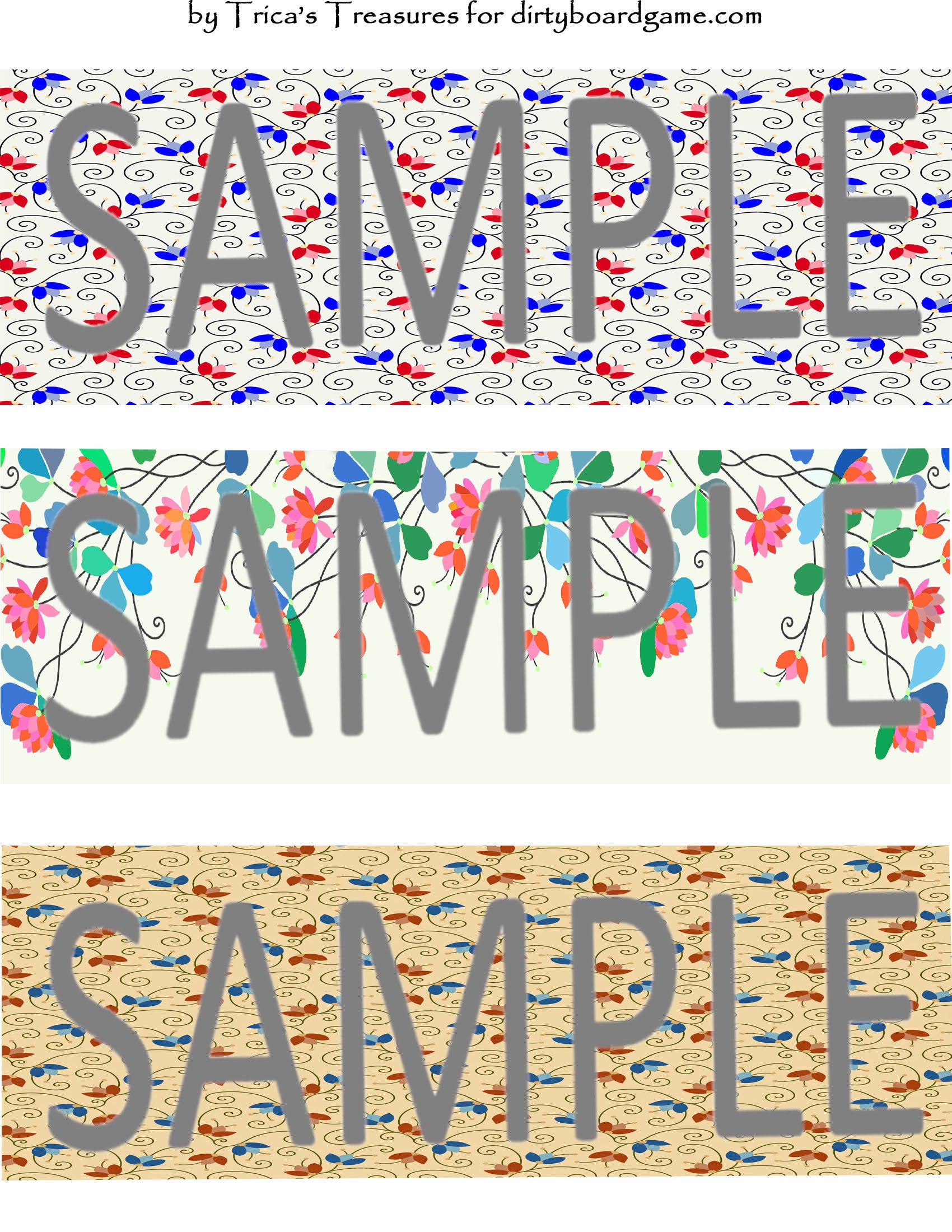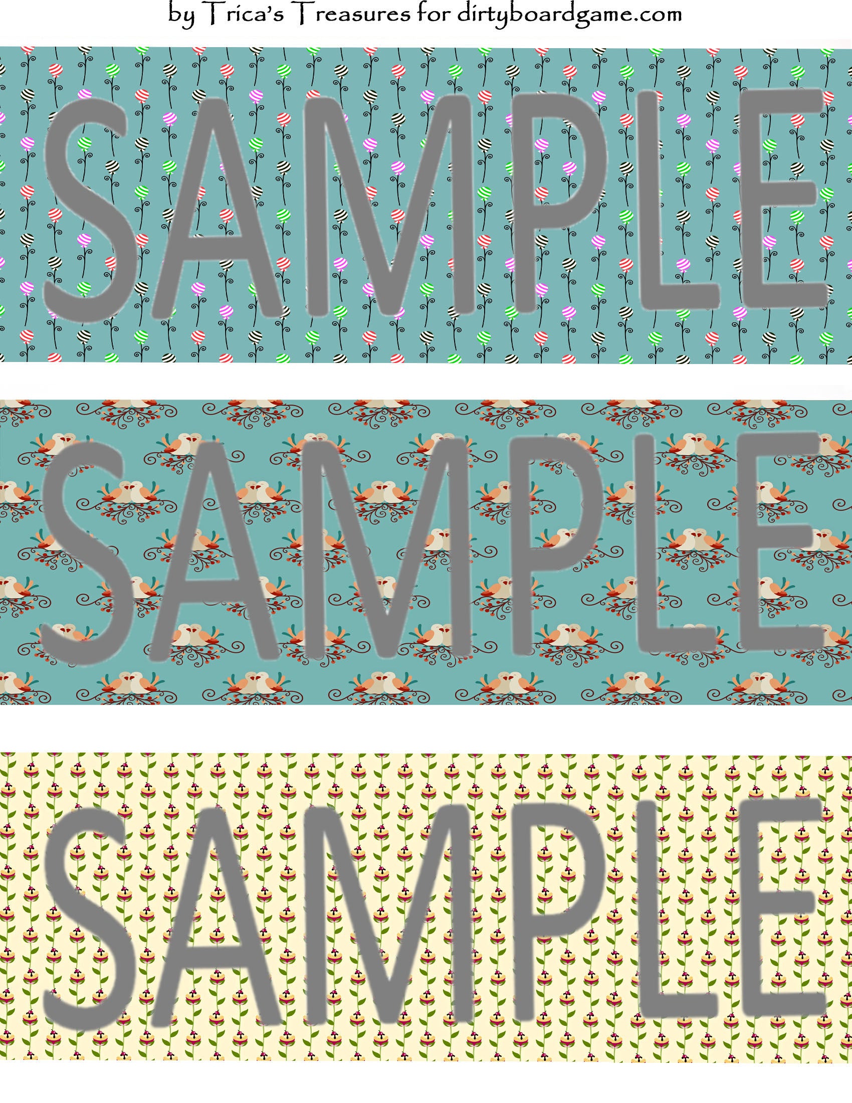 DirtyboardGame.com in collaboration with Trica's Treasures presents these choices of digital paper for making your own toppers. Download, print and cut. Attach the result to your favorite blank (or use heavy card stock) and create your own art for your toppers. Wear them, sell them, give them away - no restrictions.