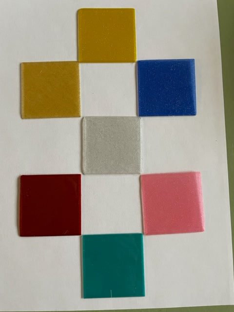 12 toppers in a set. These are not super flashy but just enough glitter to have some fun. Wear as is or add some bling. These are printed thin like our blanks so they are light-weight and bend easily to your frames.
