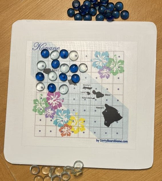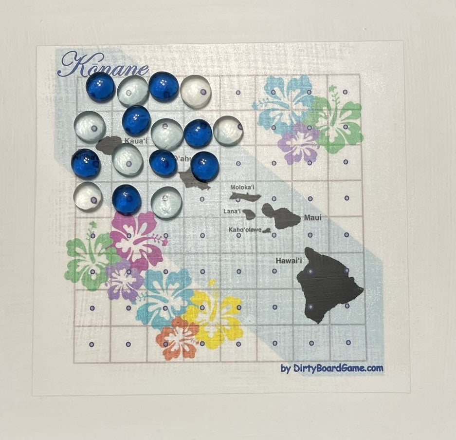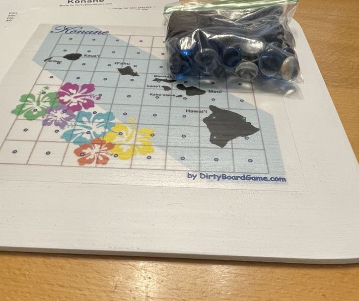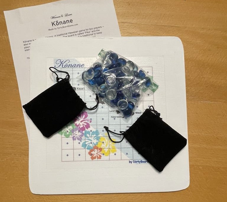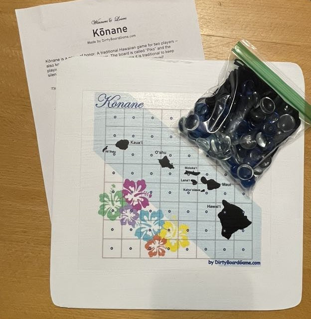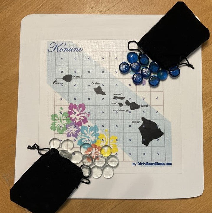 Discover the ancient strategy game of Konane, a beloved pastime of Hawaiian royalty. This elegant 10 x 10 inch wooden board features an 8 x 8 playing field adorned with beautiful hibiscus flower designs in vibrant turquoise, purple, green, yellow, and coral hues. The game comes complete with 64 playing pieces - 32 black and 32 silver "stones" - stored conveniently in two velvet drawstring pouches. Also known as Hawaiian Checkers, Konane challenges players to capture opponent's pieces by jumping, similar to checkers but with unique strategic elements. The board displays a map of the Hawaiian islands, making it both a functional game and an attractive decorative piece. Perfect for game nights, teaching traditional Hawaiian culture, or displaying as a conversation starter. Each set includes detailed instructions to help you master this classic game of skill and strategy. Note: Contains small parts - adult supervision recommended.
