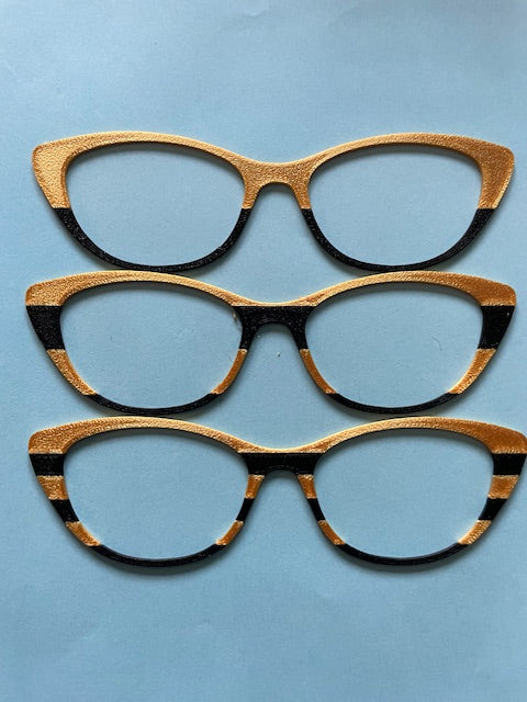 3d printed glasses toppers with magnets - printed in pebble finish. Pick the frame shape and you will receive 3 two-color toppers in varying looks. Don't see your school or team colors - contact us and we'll see what we can do.