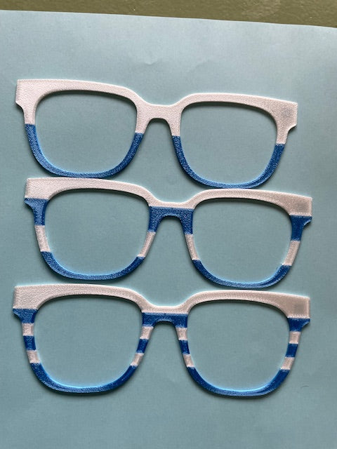 3d printed glasses toppers with magnets - printed in pebble finish. Pick the frame shape and you will receive 3 two-color toppers in varying looks. Don't see your school or team colors - contact us and we'll see what we can do.