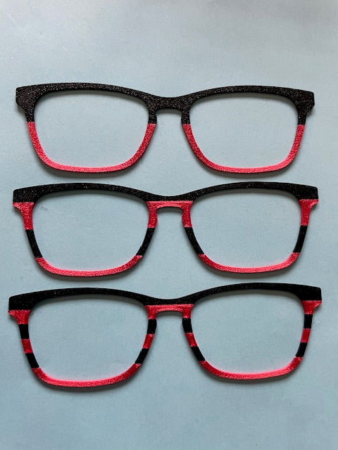 3d printed glasses toppers with magnets - printed in pebble finish. Pick the frame shape and you will receive 3 two-color toppers in varying looks. Don't see your school or team colors - contact us and we'll see what we can do.