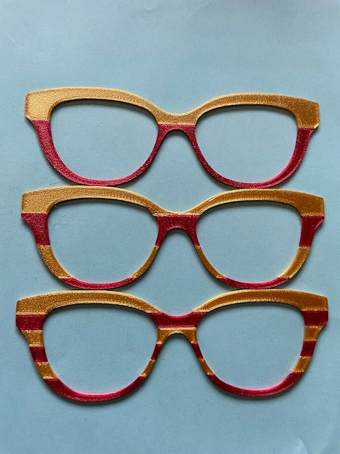 3d printed glasses toppers with magnets - printed in pebble finish. Pick the frame shape and you will receive 3 two-color toppers in varying looks. Don't see your school or team colors - contact us and we'll see what we can do.